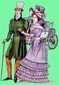 У двубортного сюртука кавалера мягкий воротничок, широкие, до колена, полы и горизонтальные карманы с клапанами. Длинные рукава слегка присборены у проймы, но облегают руку от локтя до запястья, на манжете имеется разрез. Брюки, дабы сохранять форму, натягиваются под ботинками штрипкой. Костюм кавалера дополняет цилиндр со слегка приподнятыми с боков полями и расширяющейся кверху тульей.